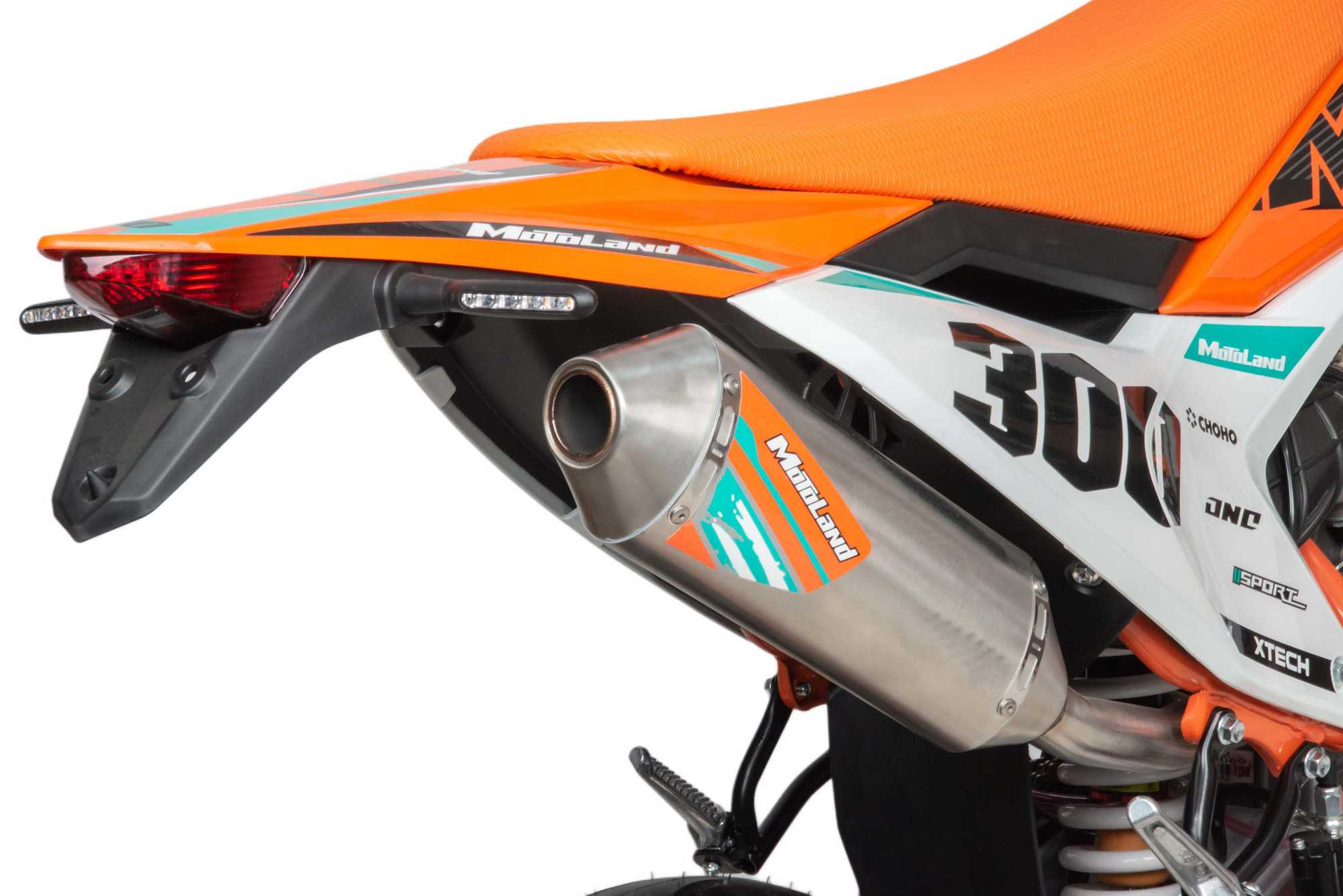 Мотоцикл Кросс SMX300 (мотард) это отличный мотоцикл в своем классе. Имеет хорошую проходимость и тяговую мощность за счет установленного двигателя ZONGSHEN 175FMM мощностью 25 л.с. ,и карбюратором NIBBi N 32 с вакуумным ускорителем. Идеален дляезды по дорогам общественного пользования, т. к. его сликовые шины (110-70) и (140-60) просто созданы для езды по среднему и твердому грунту. Телескопическая вилка перевернутого типа со всеми регулировками позволяет легко отрабатывать все неровности на дорогах. Задняя подвеска маятниковая, с моноамортизатором.