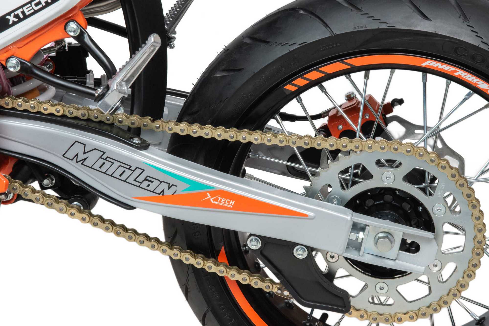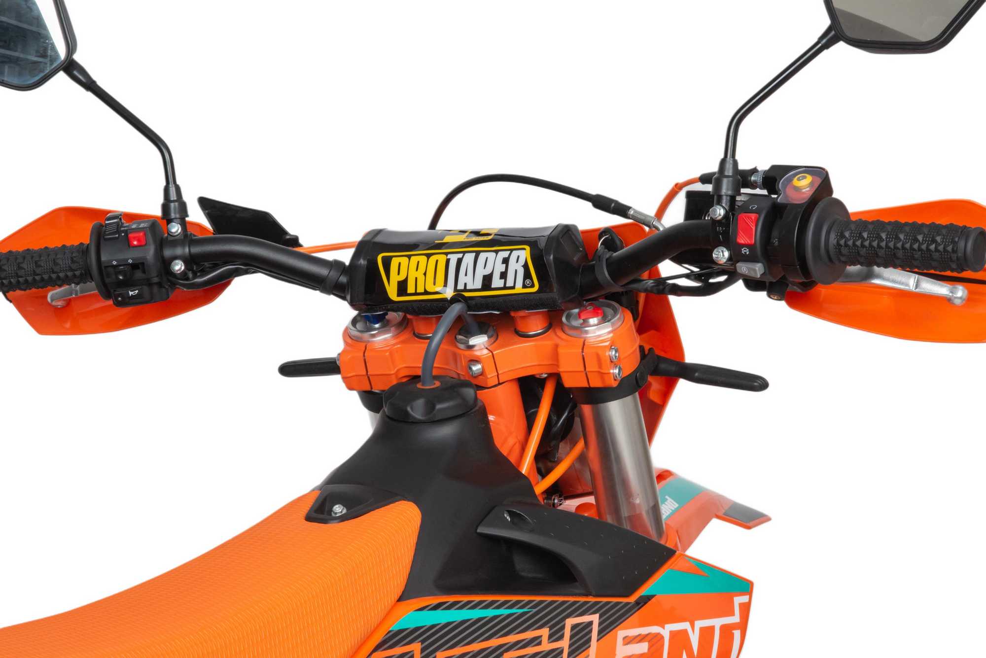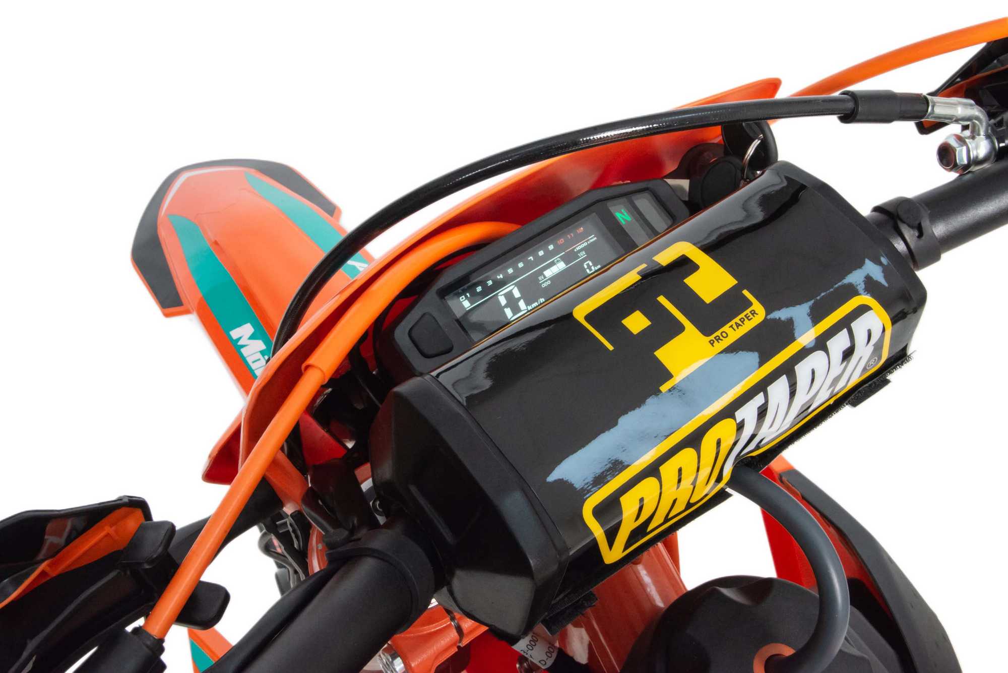 Для запуска двигателя можно использовать электростартер или кикстартер. Система зажигания электронная (CDI). Механическая трансмиссия содержит 5 передач. У мотокросса отличный запас хода:— 9 л, расход топлива — 5 л на 100 км. Передняя LED фара обновленного дизайна легко включается поворотом замка зажигания и позволяет ездить в сумерках и темноте, а также стоит эргономичная и многофункциональная приборная панель.