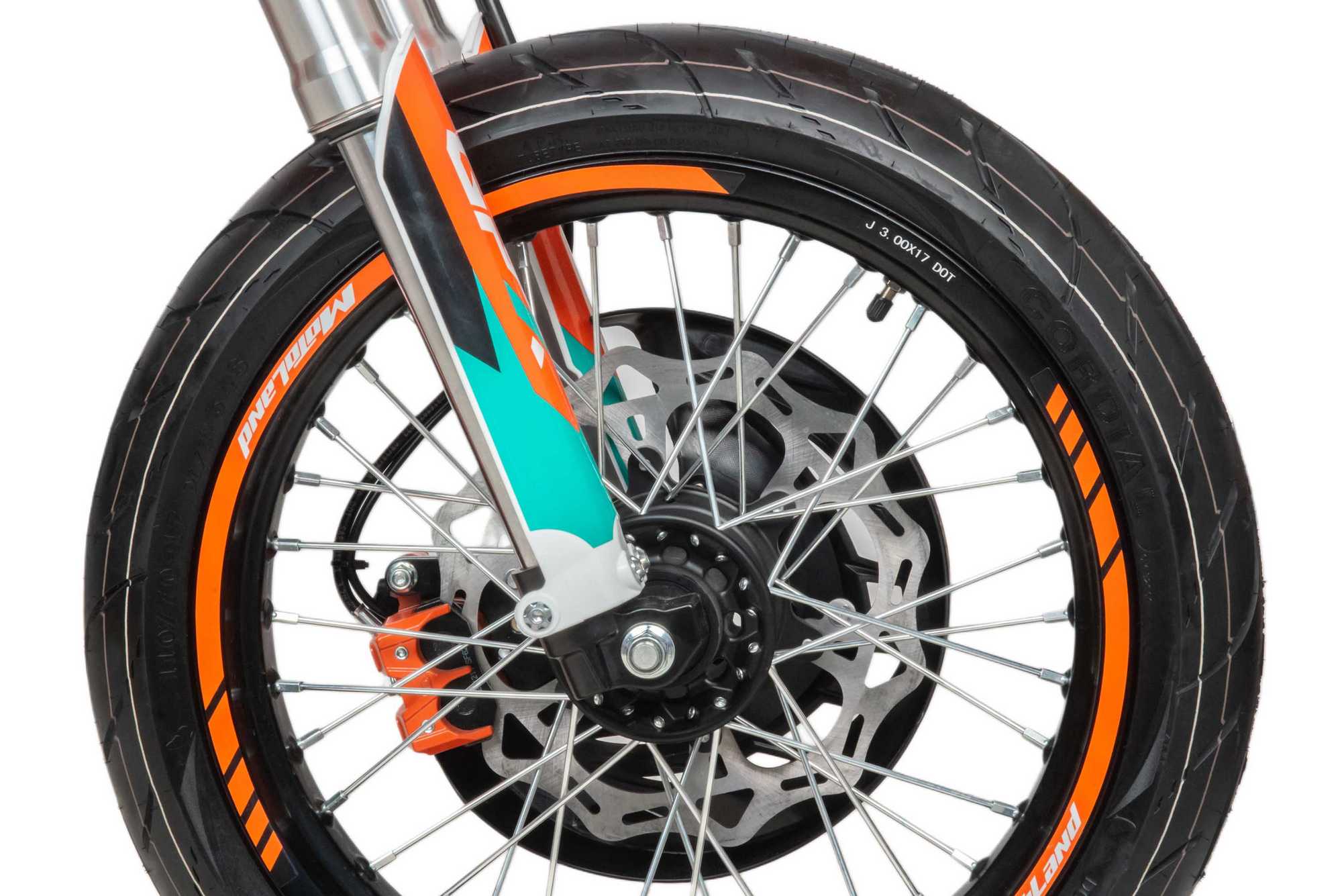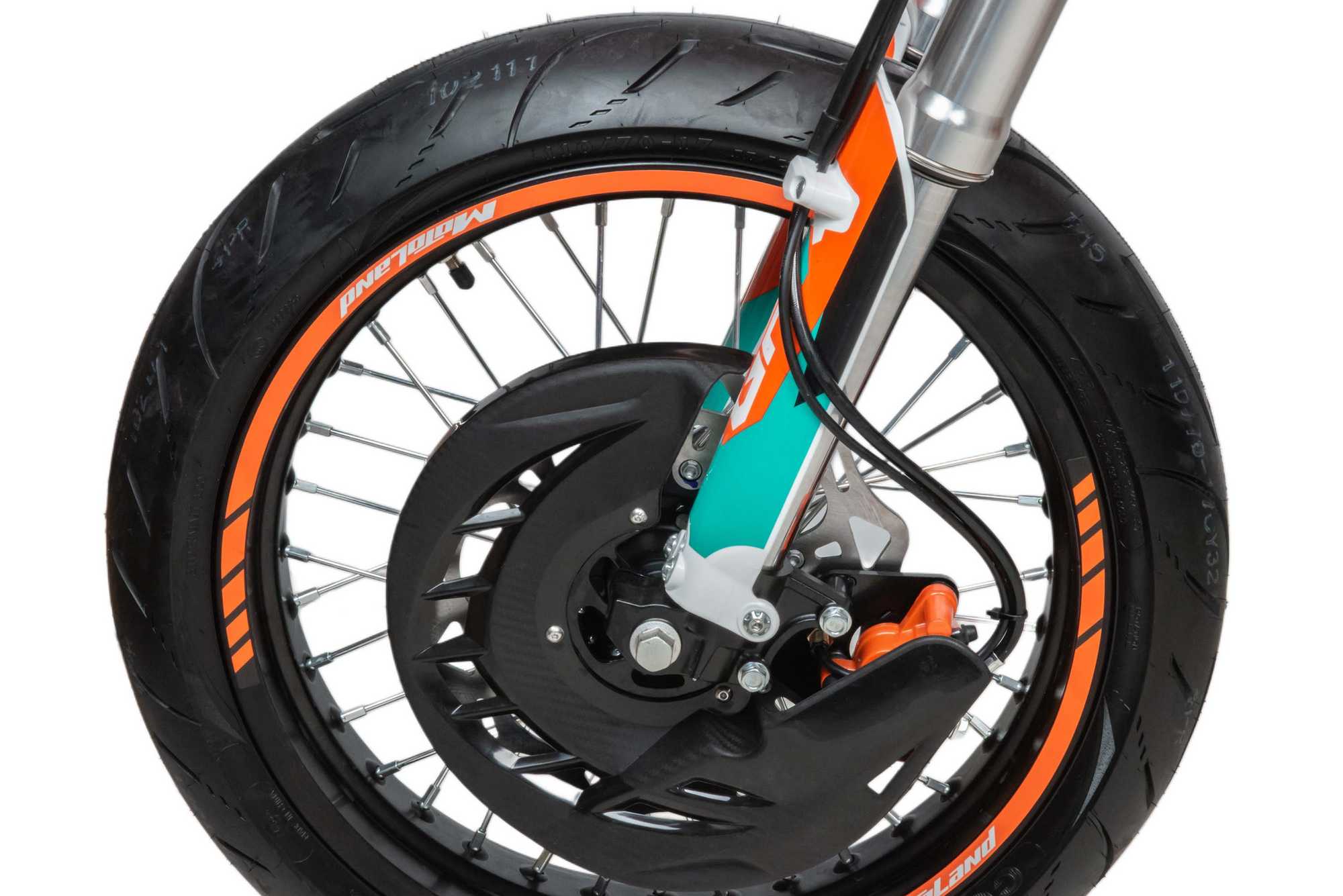 Мотоцикл Кросс SMX300 (мотард) выдерживает нагрузку до 150 кг. Прочный облицовочный пластик типа КТМ 2024 года. Надёжно закрепленный руль имеет переменное сечение: 28 мм в месте крепления и 22 мм на концах под грипсами, а также короткоходную ручку газа. На мотоцикле установлена защита рук и подножки для пассажира. Колёса алюминиевые, оснащены усиленными спицами и антибуксаторами, размер заднего колеса — 17 дюймов (140-60), переднего — 17 дюйм (110-70), тормозная система установлена с двухпоршневым тормозным суппортом на оба колеса.
