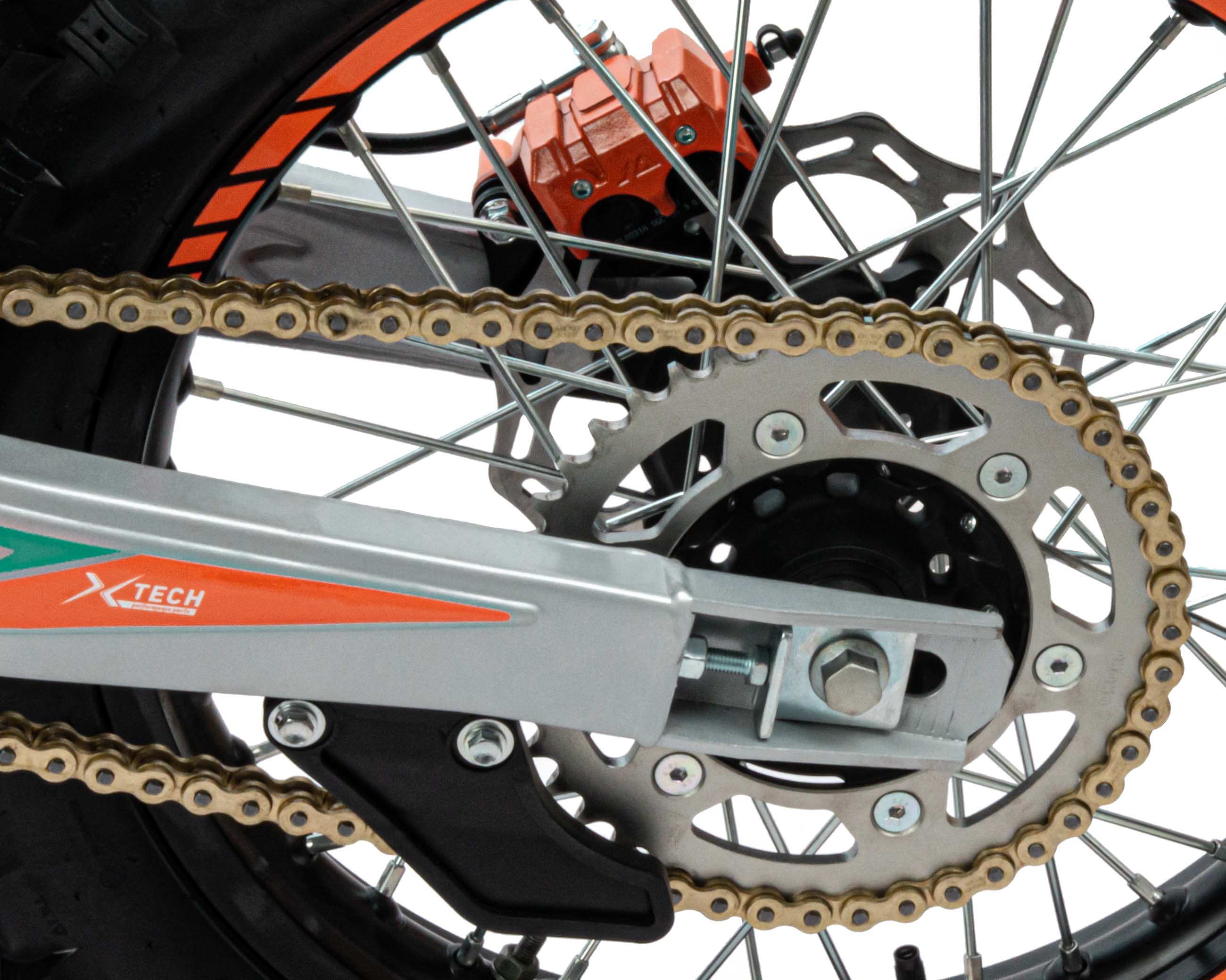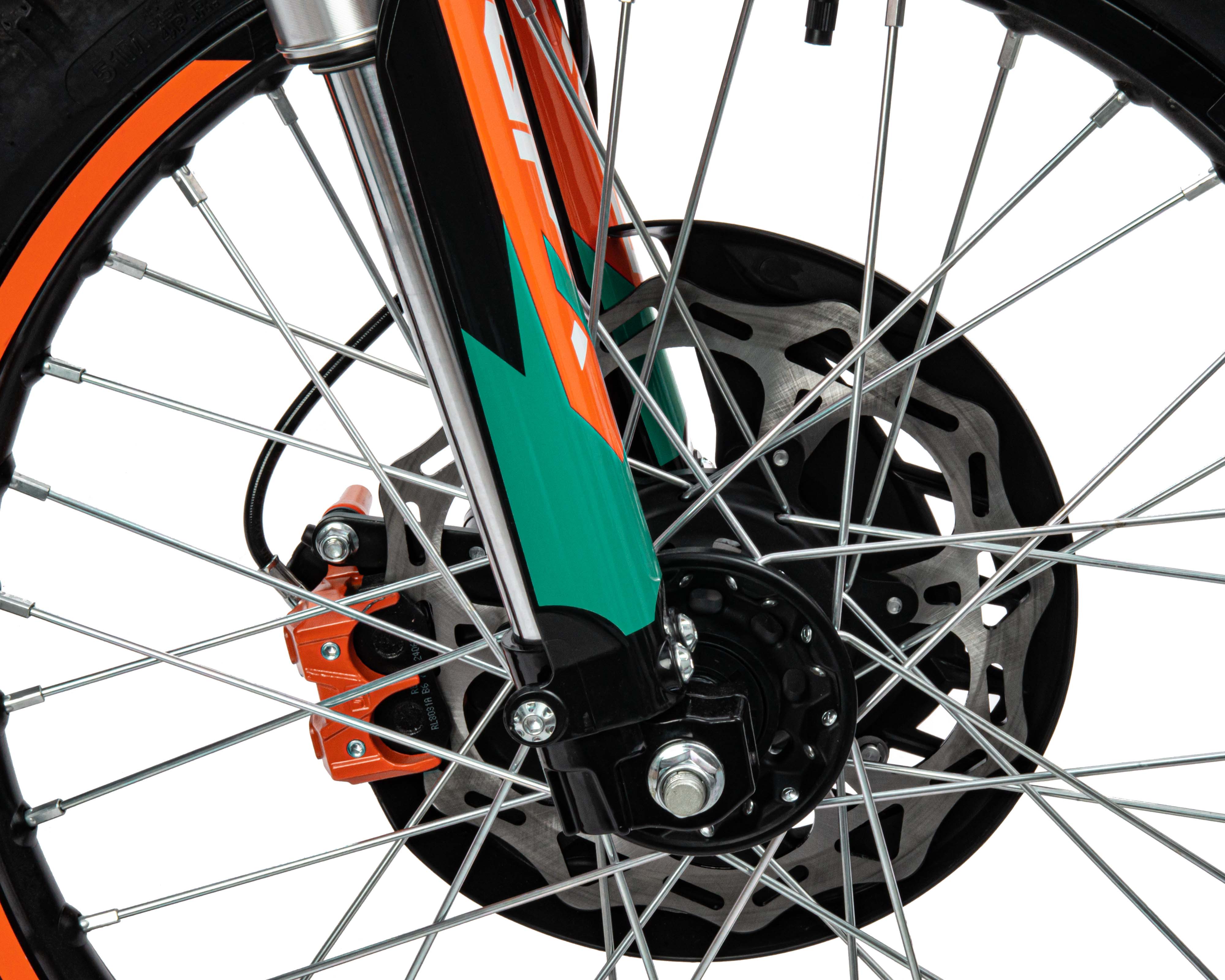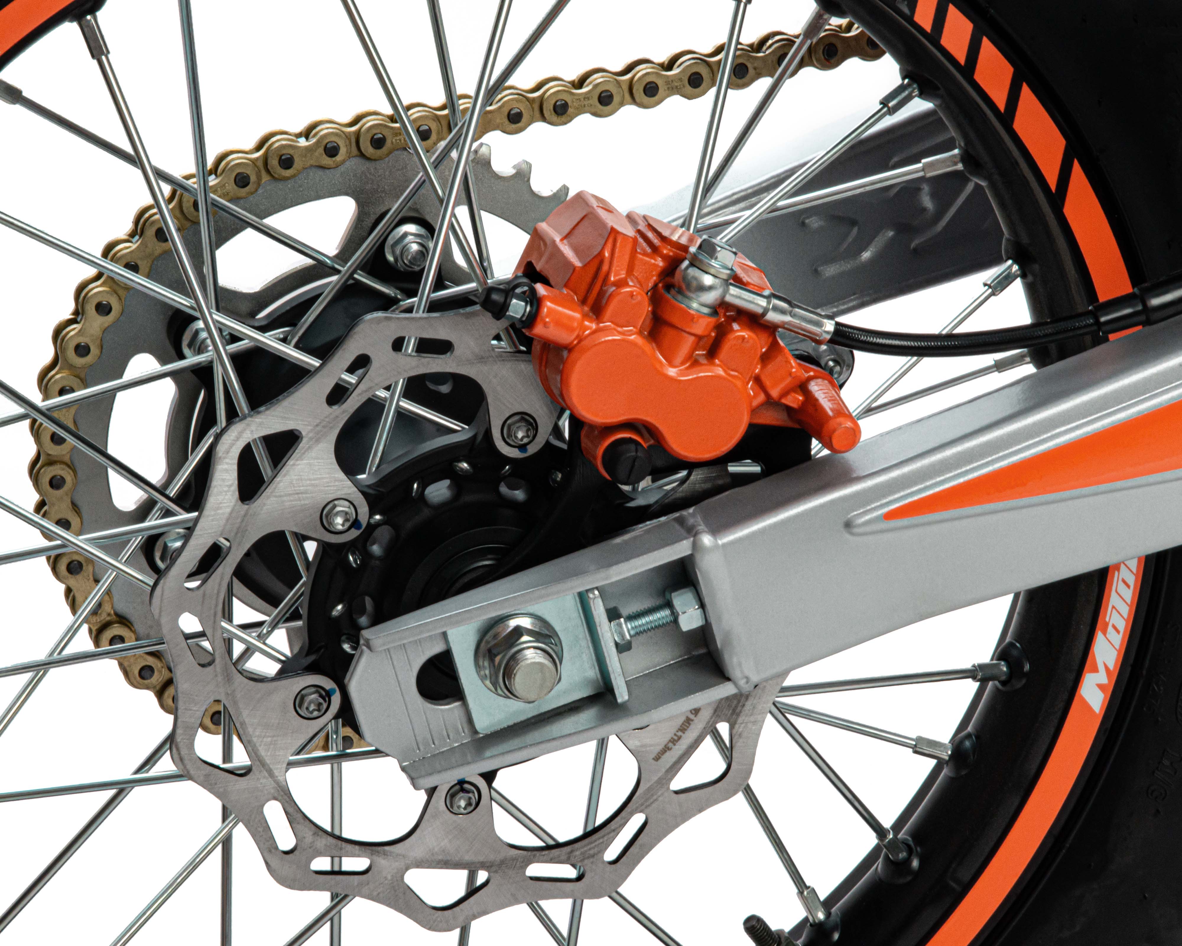 Мотоцикл Кросс SMX300, выдерживает нагрузку до 150 кг. Прочный облицовочный пластик типа КТМ 2024 года. Надёжно закрепленный руль имеет переменное сечение: 28 мм в месте крепления и 22 мм на концах под грипсами, а также короткоходную ручку газа. На мотоцикле установлена защита рук и подножки для пассажира. Колёса алюминиевые, оснащены усиленными спицами и антибуксаторами, размер переднего — 21 дюйм (80-100), заднего — 18 дюймов (120-90), тормозная система – с одно и двухпоршневыми тормозными суппортами соответственно.